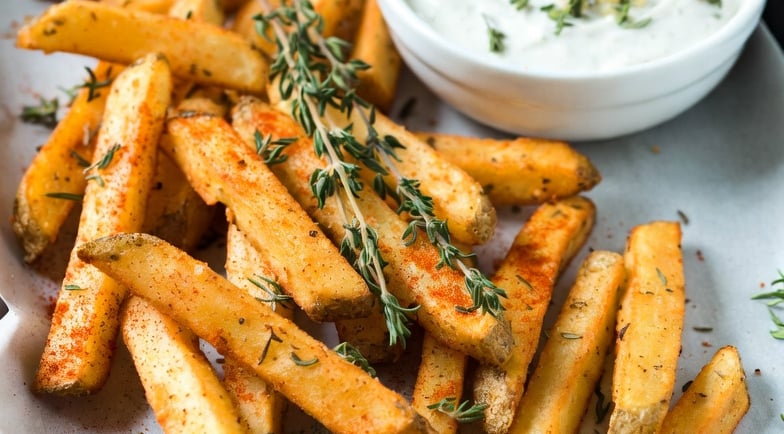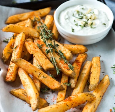 Crispy Herb-Roasted Steak Cut Fries with Garlic Yogurt Dip