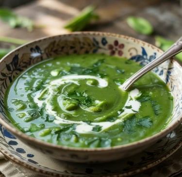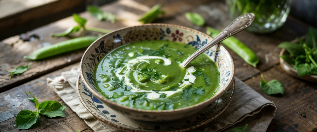 Cette soupe vibrante et nourrissante regorge de vert—les petits pois sucrés et les épinards terreux la rendent naturellement crémeuse une fois mixés. Elle est assez rassasiante pour constituer un plat grâce aux pommes de terre et aux protéines facultatives, tout en restant légère et saine. Prête en environ 35 minutes. Pour 4–6 personnes.